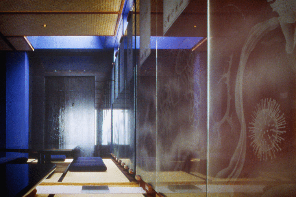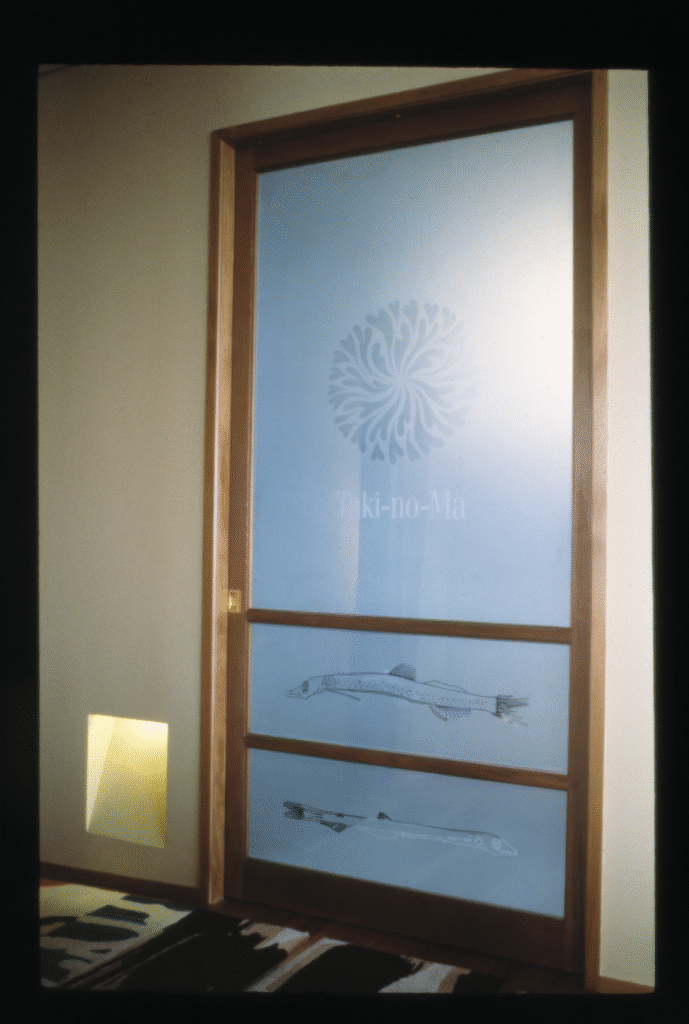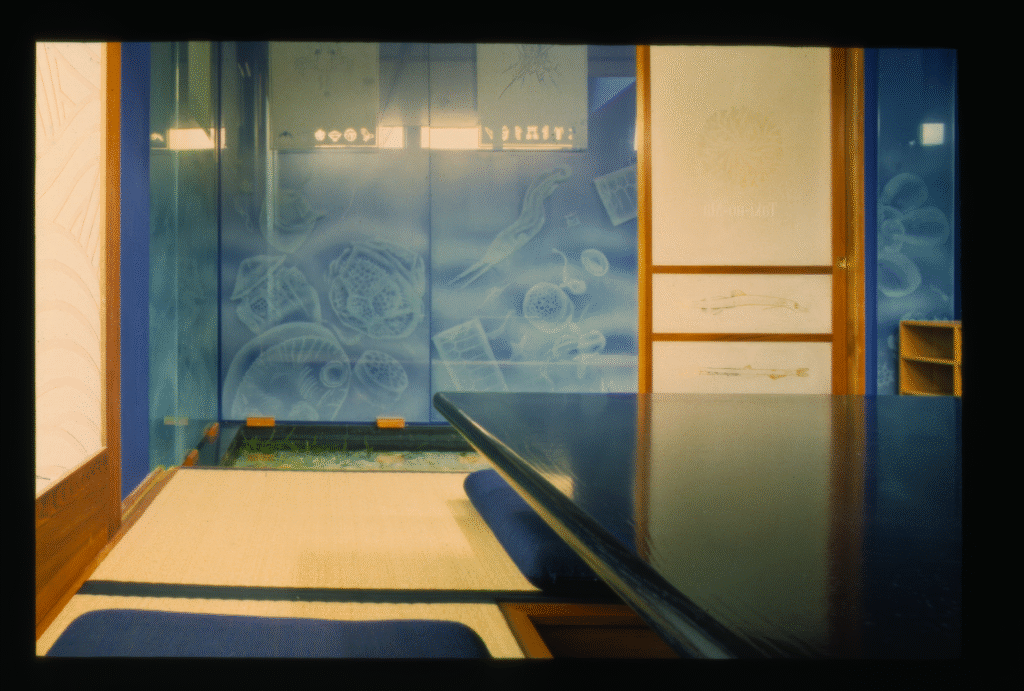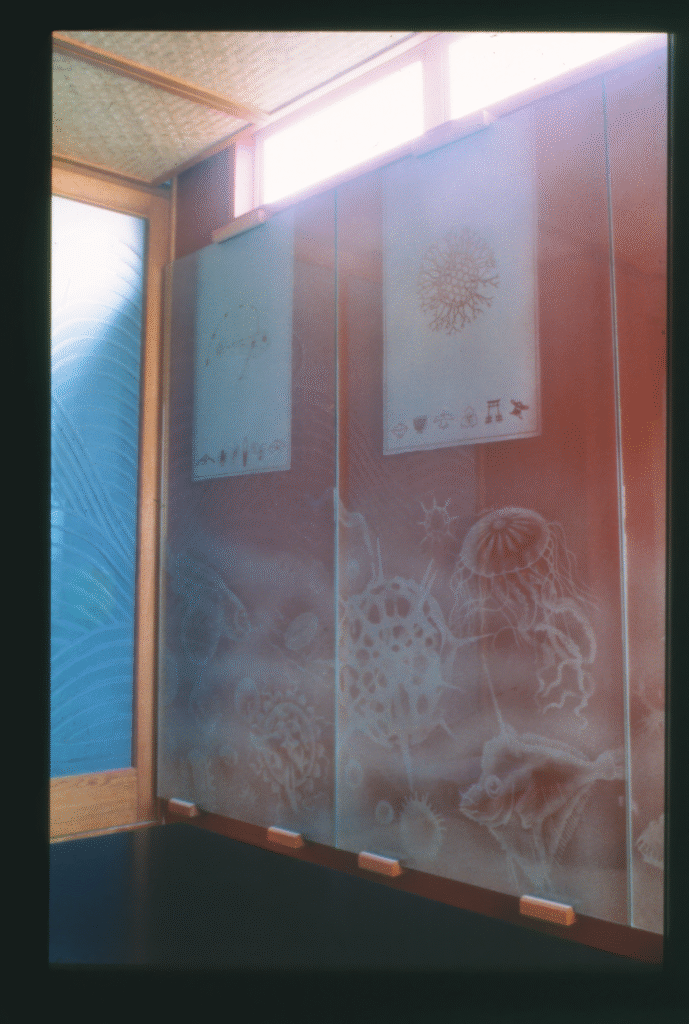 I was commissioned to design and produce art glass installations throughout. Two dining rooms were enclosed entirely in glass, very loosely informed by Japanese design but with the oceanic theme continued with sandblasted macro forms based on marine protozoa and crustacea, encasing the rooms, and on screens and doors.